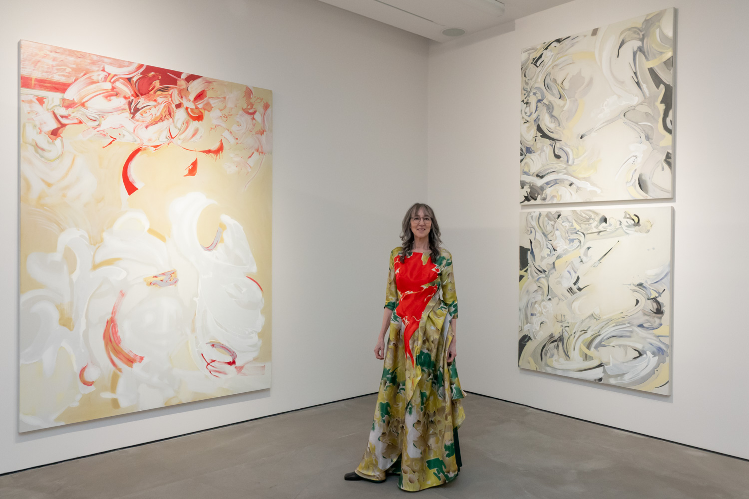 At the opening, Green stood in front of her work wearing a dress patterned from one of her paintings. I photographed it. The idea began, I’m told, as a playful exploration of how AI might translate one of her canvases into another form. The painting chosen was Ravenous, bold and saturated, a natural candidate for movement. What started as an experiment became physical.