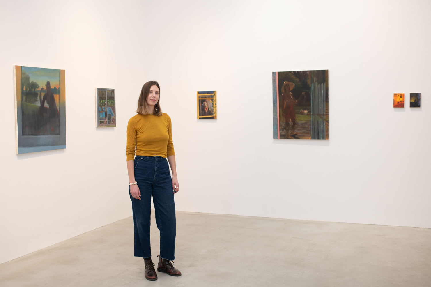 Many of these new paintings come from direct observation, often involving her own body in real time, anchored in actual places. You can feel the shift in immediacy, the way light hits skin or architecture, while the slower, layered decisions of painting remain.