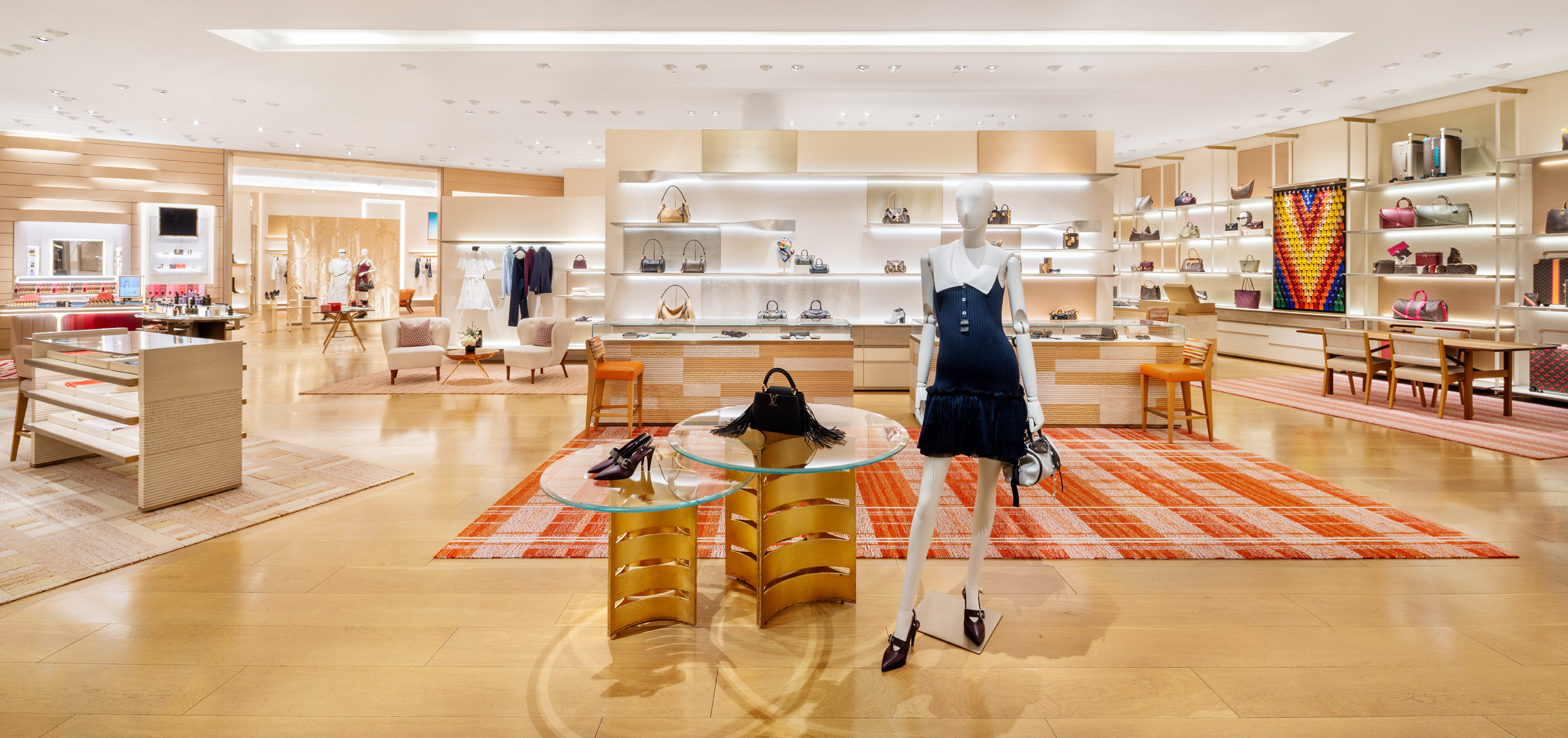 The Orlando boutique now boasts an expansive layout that showcases Louis Vuitton’s signature visual codes. From leather goods and shoes to ready-to-wear collections, the store blends modern retail design with artistry. A dedicated area for watches and jewelry highlights timeless creations, while curated fine art enhances the ambiance. Among the standout pieces is a bold painting by Daniel Klewer, known for his signature linear tactility technique that adds depth and texture through material innovation.